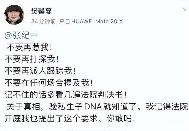 张纪中当时和樊馨蔓的婚姻还在存续期间,这个消息无疑是在指责张纪中婚内出轨。著名导演辉煌了一辈子,年过半百了名誉不保。 面对樊馨蔓的指责,有媒体向身在美国的杜星霖打电话求证,杜星霖则表示一切都是假的,她不会和一个丧失理智的人去辩解。 杜星霖告诉记者,她不过是只是负责工作,张纪中的工作人员而已。她把自己推得一干二净,完美隐身,让炮火继续放在当事人身上。